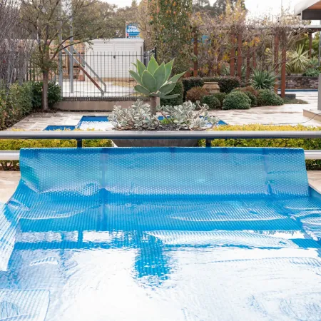 Your pool blanket rolls onto the hidden roller mechanism beneath the bench seat. When needed, you simply pull the cover across the pool and roll it back using the hand wheel or crank.